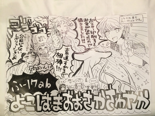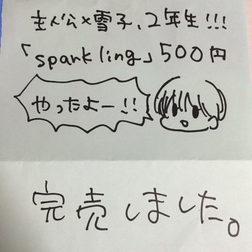 2014.10.14 Tue 02:03:41 スパークありがとねスパークお疲れ様でした。さしいれごちそうさまです。 主雪が好きな人、または興味がある人に本は行き届いたでしょうか。 当初「コピー本5部」で足りるだろうと予想していたんですけど、 (てかふるやさんがそれで申し込んだという)予想よりだいぶ出たので嬉しいです。 ぺよんサークルはたくさんあれど、主雪サークルは「よこはまおおさかさわやか」だけ!なんでや!もっと主雪描いてほしい!です! (甘いのエロいの切ないのドンと恋!) ▼勢いが好きすぎるふるやさん手描きポスター(でかい) ▼二年生好き必見!宝物の「じゃこ帳(ウラノver)」を展示してました。(ふるやverもあった) ▼即席値札をふるやさんに作ってもらいました。そして完売しましたありがとうございました。 日記を追記予定。 PR 2014.10.05 Sun 11:31:36 スパーク新刊案内10/12 スパーク9 東5 ふ-17ab 「よこはまおおさかさわやか」※じゃこさん、ふるやさんと主雪合同サークルです。スペースNo.は「ふるや17歳」って覚えてください。 新刊「sparkling」A5 P36 オフセット 500円 となります。 内容は今年初めに消失したサイトのまとめ。主雪と二年生の日常を綴った短編群。鉛筆書きそのままで当時の雰囲気を残しつつ加筆修正と、ささやかですが書き下ろしもあります。2014年版と言った感じでしょうか。ちなみに表紙はオンデマです。キラキラするはず! 続きからサンプルです。 2013.10.28 Mon 22:50:40 ドジ担当花村が肝心なときにコケてくれます。 女子2人(たくましい)に助け起こされてる姿はなんとも不憫でかわいいですね。 二年生の戦闘が楽しくってサウナ篭りっきり。ちっとも進まない。 ところで「千枝ちゃんが敵を捻り潰すクマ!」ってクマナビが大好きでこれ聞けるとテンション上がるんです。 千枝にはとどめ頑張っていただきたい。 (文化祭の準備できてない…!) |